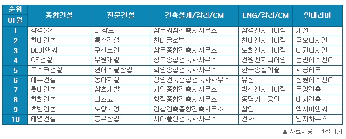 ▲삼성물산(1위) ▲현대건설(2위) ▲DL이앤씨(3위) ▲GS건설(4위) ▲포스코건설(5위) ▲대우건설(6위) ▲롯데건설(8위) ▲한화건설(11위) ▲호반건설(12위) ▲태영건설(13위) 순으로 인기순위 톱10에 이름을 올렸다.