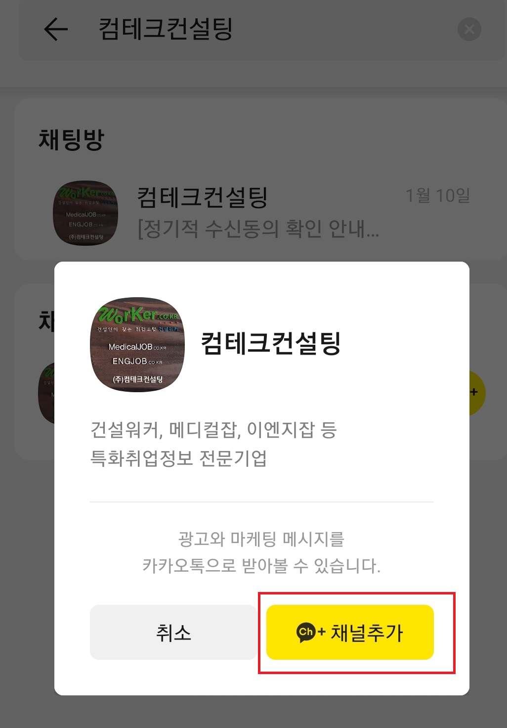 3. 검색창에 '컴테크컨설팅'을 입력합니다. 건설워커, 메디컬잡, 이엔지잡 등 개별 채널을 입력하셔도 됩니다.