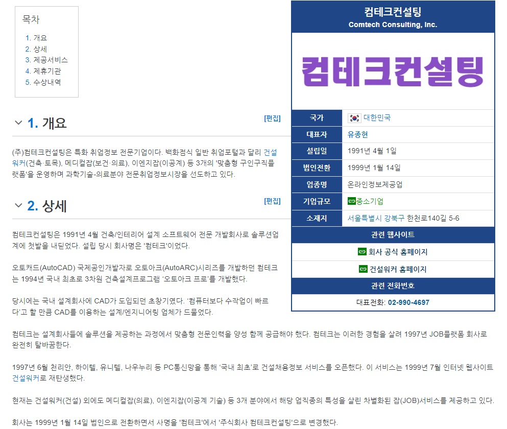 회사가 운영하는 건설워커는 국내 최초 최대의 건설구인구직 플랫폼이다. 1997년 천리안, 하이텔, 유니텔, 나우누리 등 PC통신망을 통해 서비스를 시작했다. 1999년 7월에 인터넷 취업플랫폼 건설워커 사이트를 열었다. 건축, 토목, 인테리어, 플랜트설비, 조경, 설계·엔지니어링, 감리, CM, 자재, 부동산 등 건설산업 부문에 특화된 채용정보를 제공한다.
