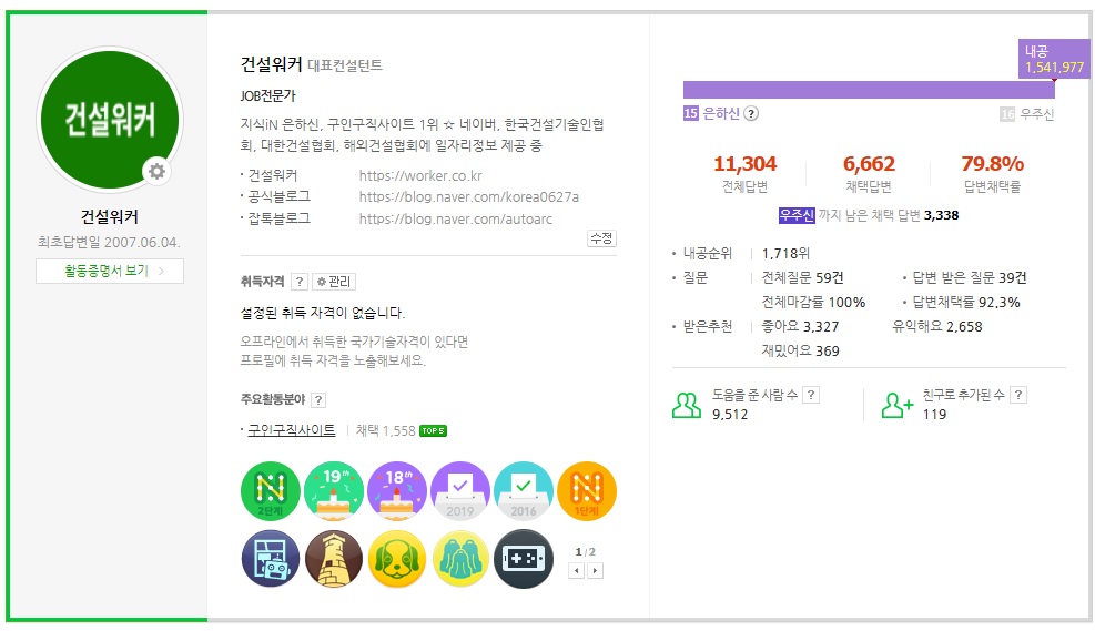 배성원 건설워커 이사는 바쁜 시간을 쪼개가며 네이버 지식iN에서 '건설워커' 닉네임으로 활발하게 활동 중이다.