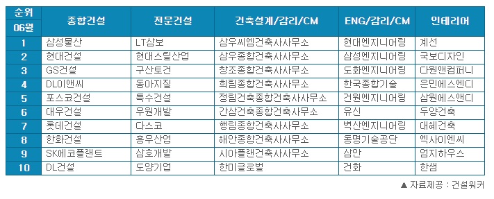 건설워커(대표 유종현)가 '6월 건설워커 랭킹' 을 7일 공개했다. 삼성물산, 현대엔지니어링, LT삼보, 삼우씨엠건축사사무소, 계선이 각 부문에서 1위를 고수했다.