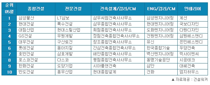 - 5월 건설사 취업인기순위 부문별 톱10(wr2005.jpg) / 자료=건설워커