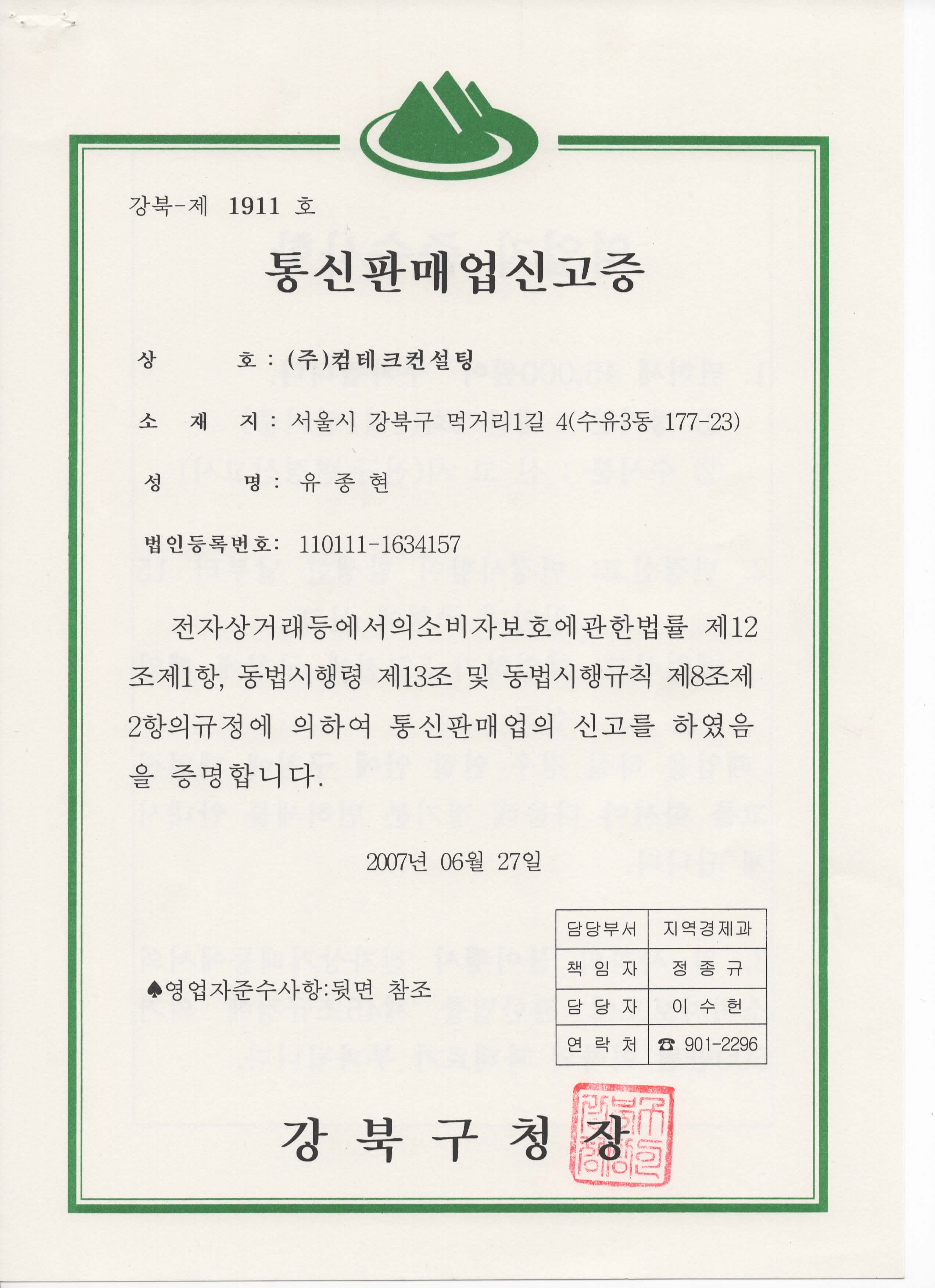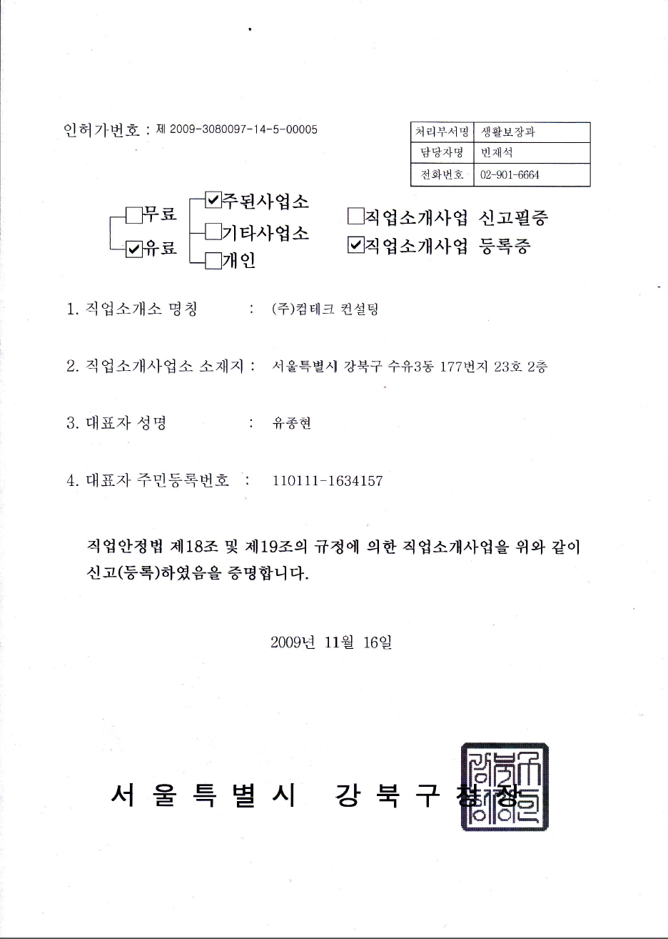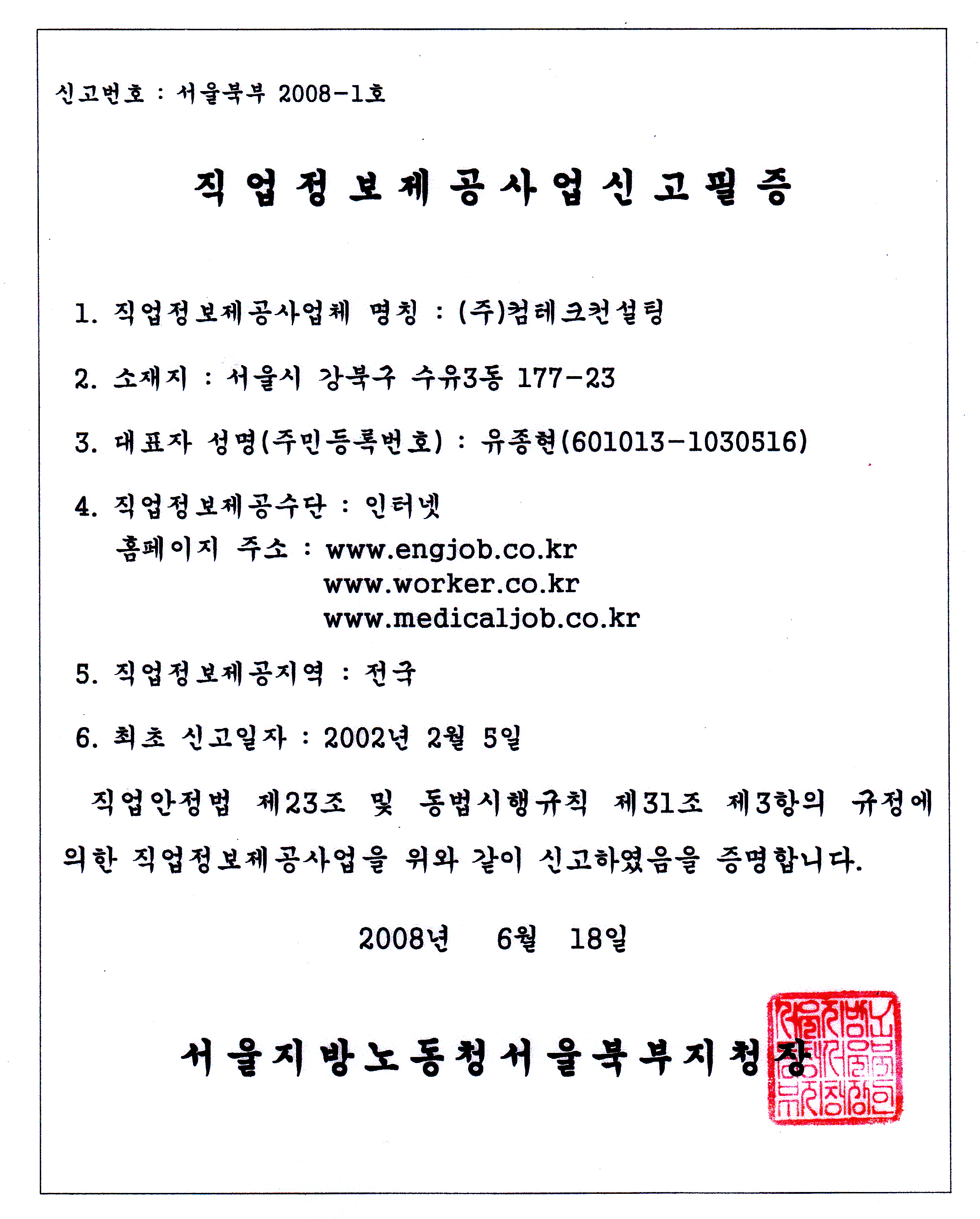 (주)컴테크컨설팅, 건설워커, 메디컬잡, 이엔지잡 | 대표이사 유종현 | 서울 강북구 수유3동 177-23 (2F) | 사업자 등록번호 : 210-81-25058 | TEL : 02-990-4697 | Mail : helper@worker.co.kr | 통신판매신고번호 : 강북-제1911호 | 사이버몰의 이용약관 바로가기
