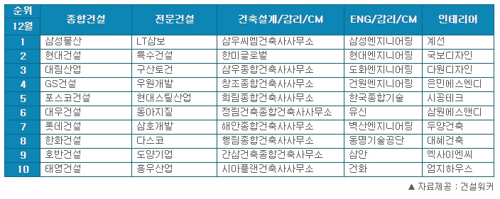 #건설워커 #취업인기순위 #12월랭킹 #종합건설 #전문건설 #엔지니어링 #CM #감리 #건축설계 #인테리어 #실내건축
